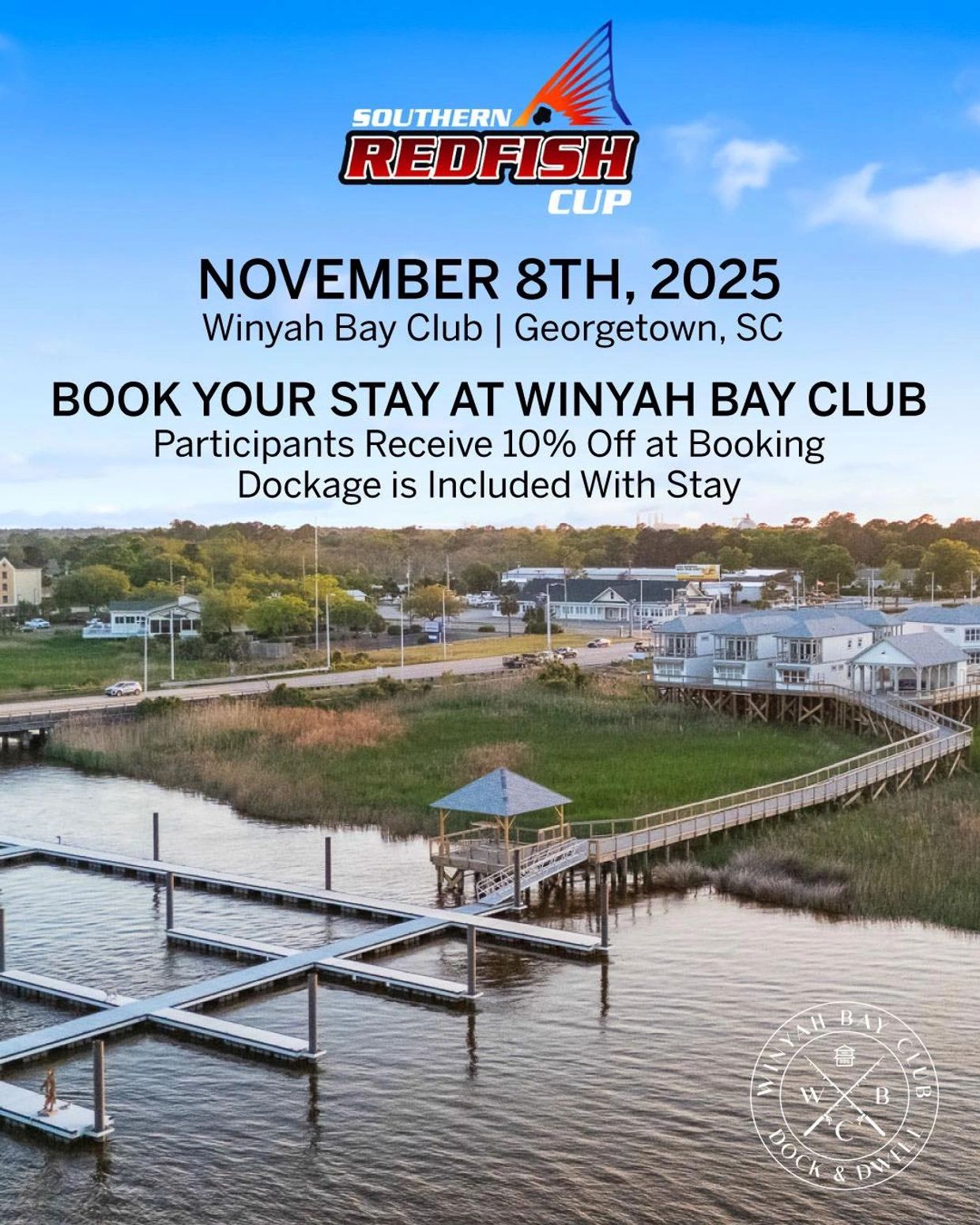 Whether you're coming to prefish or for tournament weekend, Winyah Bay Club is offering 10% off with code REDFISH10—dockage included at no extra cost.